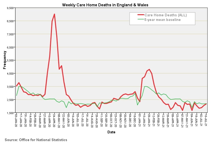 The first is that deaths allegedly due to COVID during the first wave make a surprisingly modest impression in comparison to the mean baseline – something I was not expecting! Even more surprising is that COVID care home deaths during the third wave fall below the 5-year baseline. No doubt some folk will be keen to praise the vaccine but we must also bear in mind that it could well be adverse reaction to vaccines that generated the final spike! Naturally I shall be examining the veracity of both arguments over the next few days.