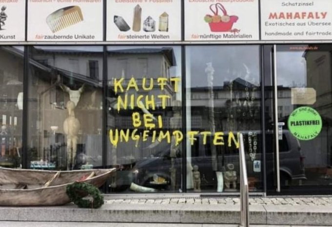 Kauft nicht bei Ungeimpften Posted byjascallyDecember 11, 2021Posted inDiscrimination, Tyranny, Unvaccinated Share this: Click to share on X (Opens in new window) X Click to share on Facebook (Opens in new window) Facebook Like Loading... Related