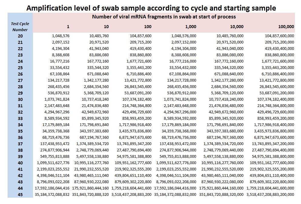 RT-PCR Test Amplification Table from John Dee’s Almanac excellent facebook site – John Dee’s Almanac | Facebook His own words below We’ve had some excellent discussion on this in the group recently so I fancied knocking this table up whilst my tea brews. If you start with just 1 viral mRNA chain and flip thisContinue reading “Yes, Turn it up to 11 again”